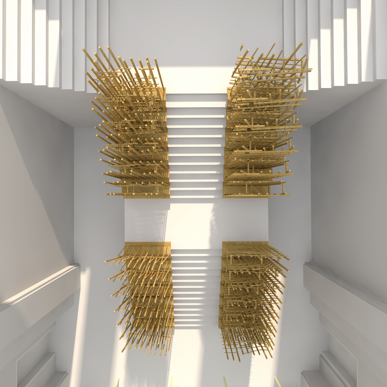 The “Sottilissimo Templum” is a manifesto of sacred architecture and is itinerant as it is designed to be built in the landscape in different places and at different times.The project evokes the “Fundamentals” of architecture and, listening to the natural environment of the garden – then the vineyard – captures its geometric, constructive and material rules, inserting itself between them with a subtle pragmatic and immaterial balance.It is an informative mapping of the growth of trees in 115 points of a Cartesian grid placed every 1.20mX1.20m. It reveals a nature in the making, the growth geometry of the movement of plants.The planimetrically based project on Cartesian rules is also based on natural diagrammatic, soft, vectorial, sectional geometric rules, capturing the light frequencies of the garden as a growth factor for the development of an “immaterial” volume. 115 very thin, vertical constructive elements, recorded on the Cartesian grid of 1.20mx1.20m grow “biologically” according to their reception of light-shadow and rhythm their movement of golden growth. 8 vertical steps, 8 two-dimensional material textures of each “very thin” build a precise abacus that preludes the infinite possible.It is a manifestation of an innovative architecture where nature studied in vitro is a reservoir of new design rules. As a rule based on the universal concept of natural numbers, it wants to compare its validity in different contexts.The spatial ensemble registers, almost invisible, a portion of space called “templum” which restores the park’s vocation as a place for meditation, pause, slowdown.In the templum, a “very thin” element made with innovative nanostructured laboratory materials summarizes the material exploration of future antisimic architecture.In its second stage, the Sottilissimo retraces in vitro the millenary centuriation of Franciacorta 1.50mx1.50m entering directly into a vineyard.The rule of the “Sottilissimo Templum” stands as sacred architecture where nature is its constructive, geometric, material principle and is designed for a spiritual, choral dimension.The project is dedicated to Giuseppe Terragni’s Danteum where it takes up the planimetric golden rule.